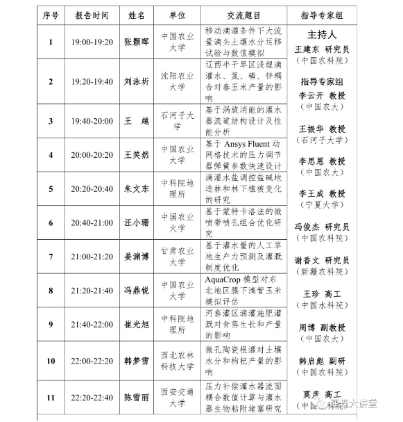 ? ? ? ? 研究生論壇專題交流會(huì),有關(guān)微灌課題研究及成果匯報(bào)。